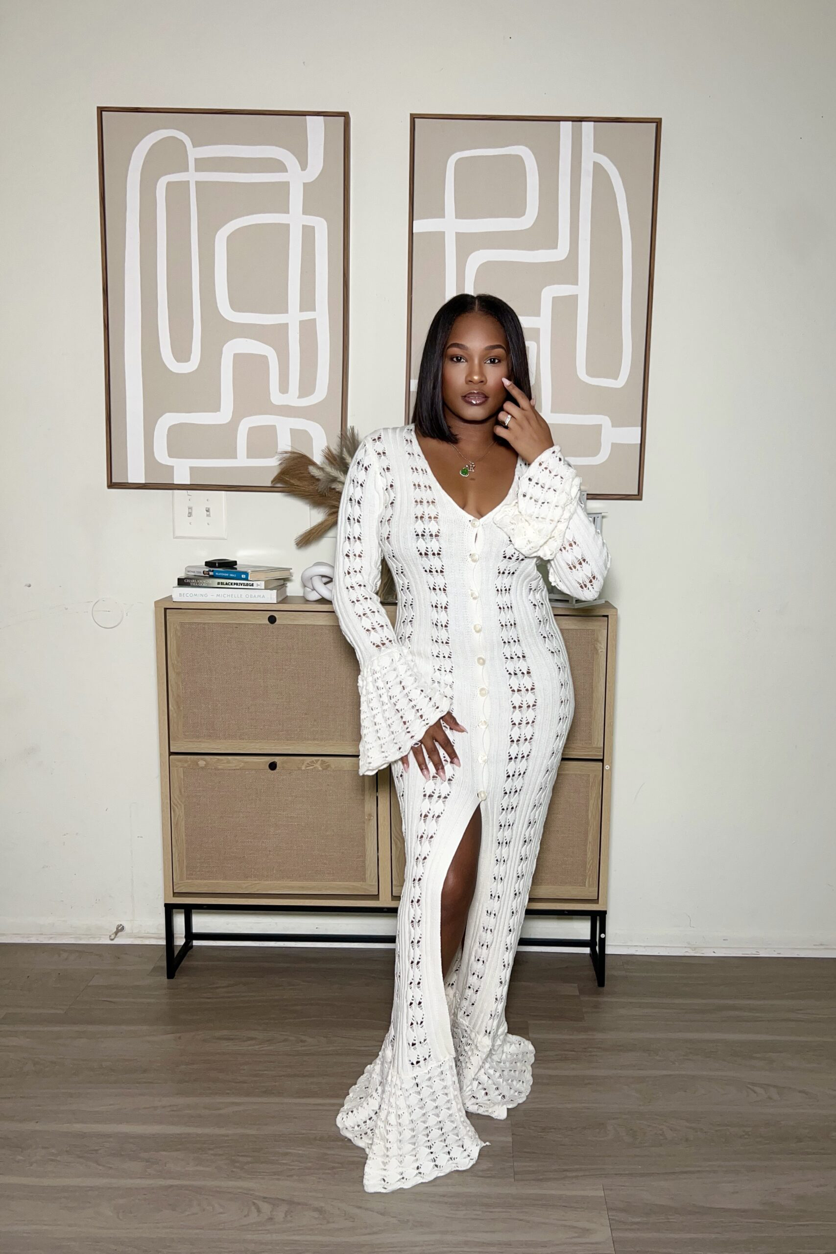 Turn heads in our Coastal Crochet Gown, a dreamy maxi dress that hugs in all the right places. Featuring delicate open-knit crochet, flared sleeves, and a flattering button-down silhouette with a front slit for a sultry finish. Whether you’re strolling seaside or sipping wine under the stars, this look brings goddess energy all day long.